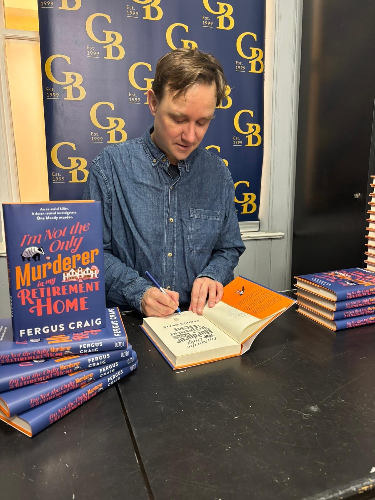 I signed some copies at Goldsboro Books in town. A pile of first editions, displayed nicely, and then Isabel from my publisher and a lady from the shop, taking pictures as I reenacted signing them because we forgot to take photos while I was actually doing it. I felt as if I were pretending to be a real author, playing the role. I at least took my Blue Jays cap off, but still wore my Reeboks. Now that I’m a proper author, now that I’m the sort of writer who does signings and whose agent takes him to The Ivy, shouldn’t I be wearing a tweed blazer or something? Shouldn’t I have a glass of red wine in my hand?